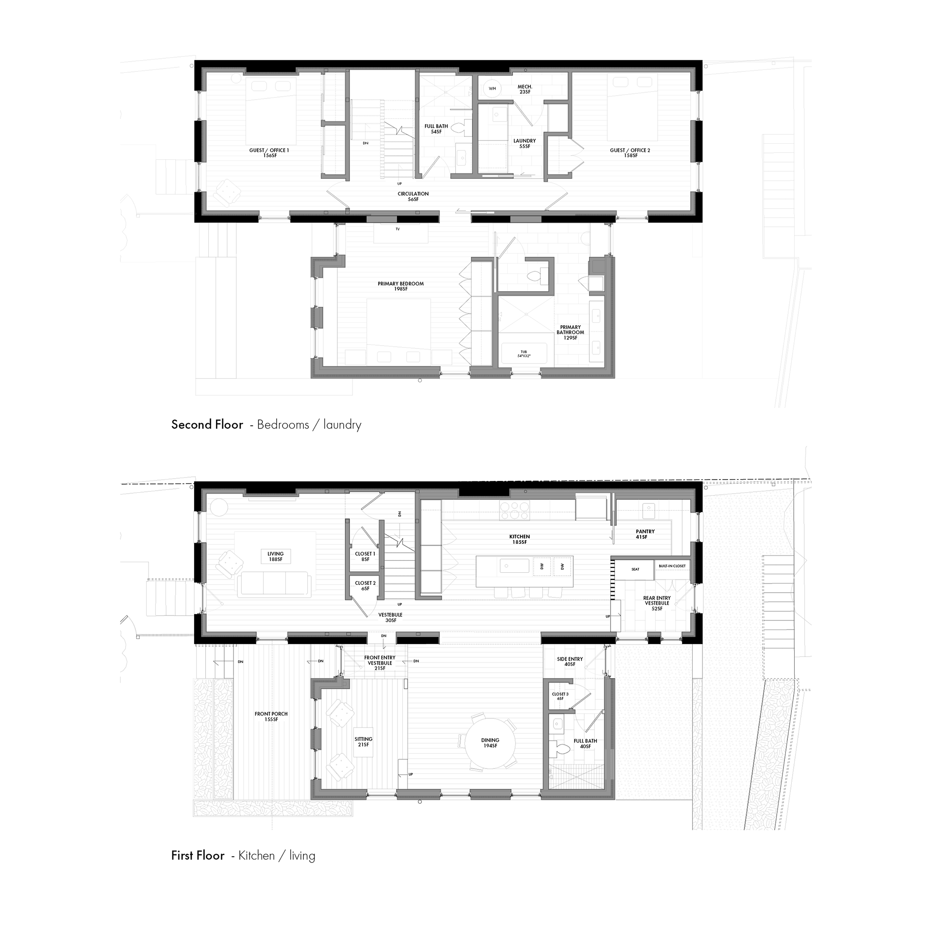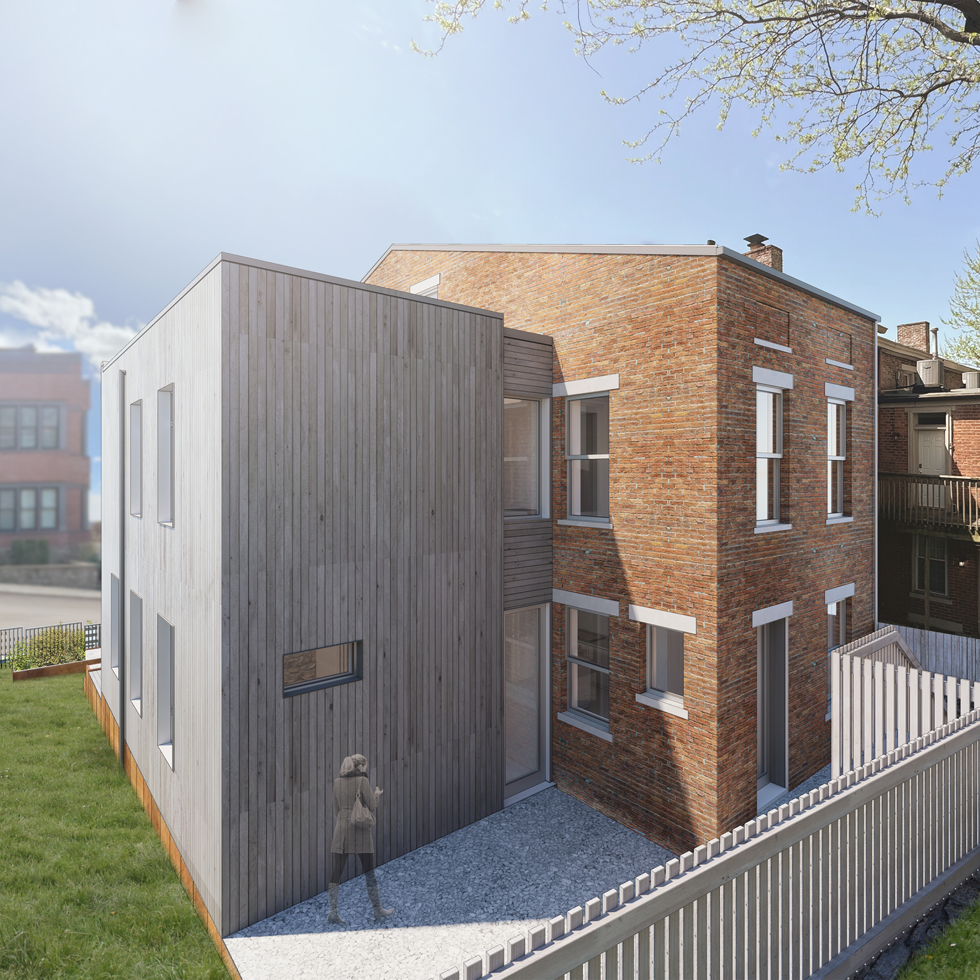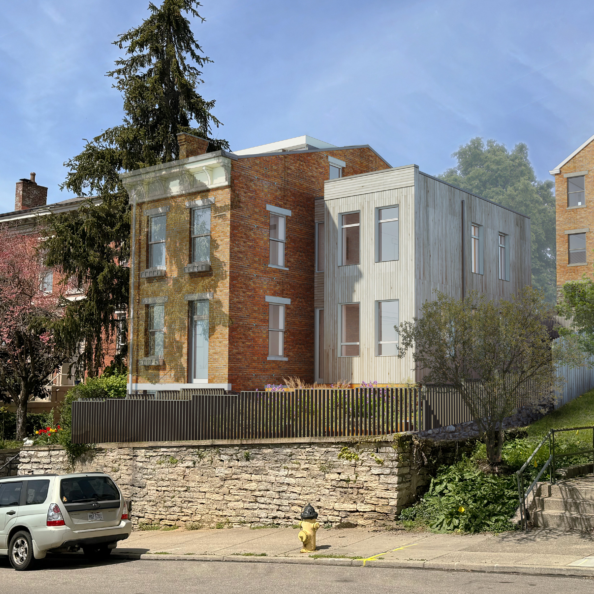 This project, located in the Prospect Hill neighborhood of Cincinnati, Ohio, started as a simple renovation of a single structure. The scope expanded over time to include a total of three buildings adjacent to one another. Each were in a state of severe disrepair with extensive water damage and neglect due to being vacant for years. It was determined that one of the buildings would not be viable to repair but instead needed to be demolished. Of the two remaining structures, one would receive only an interior renovation, while the other would receive both a renovation plus a sizable addition.
