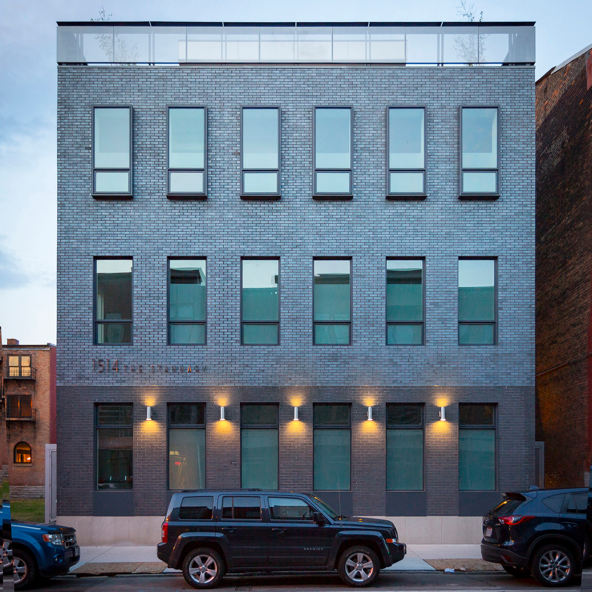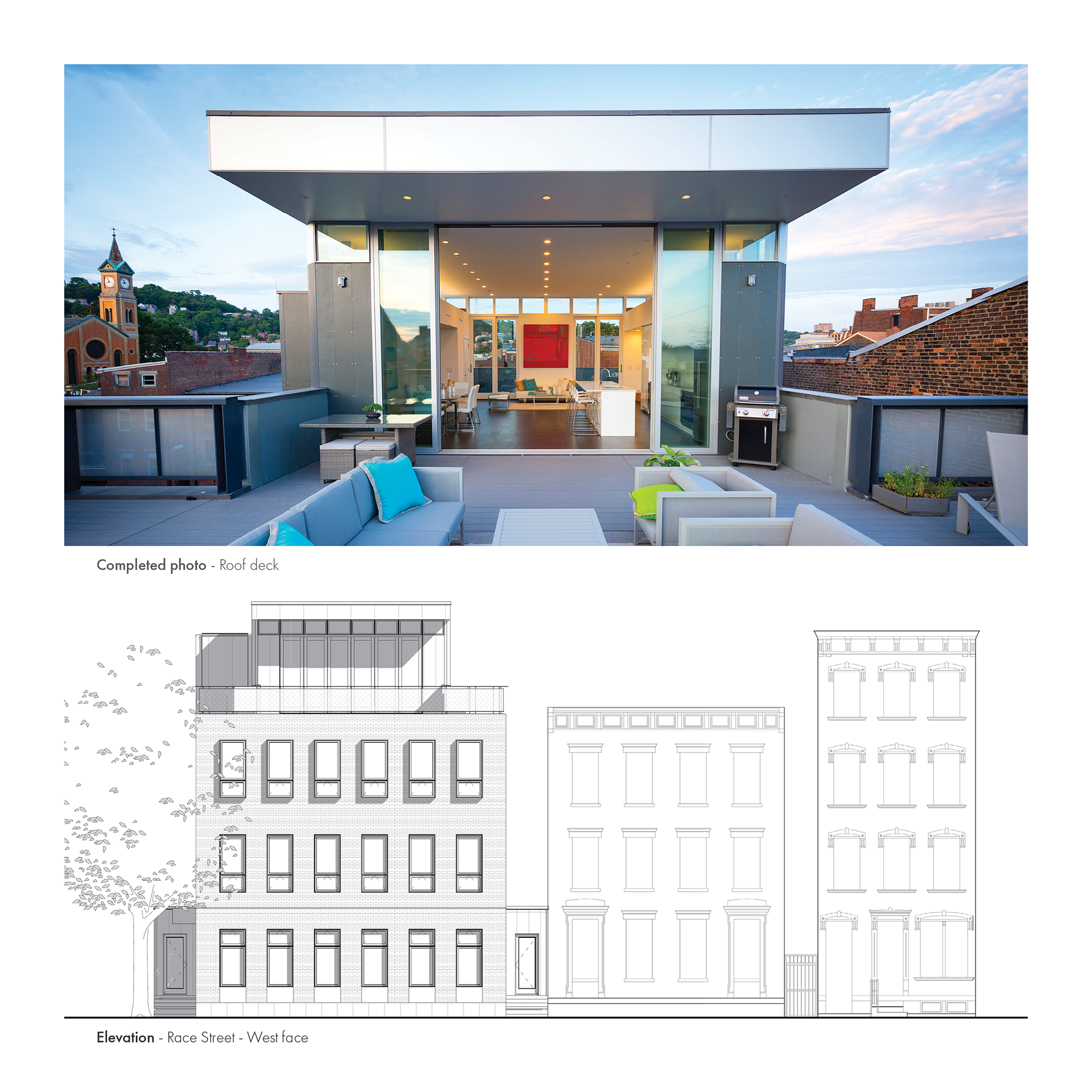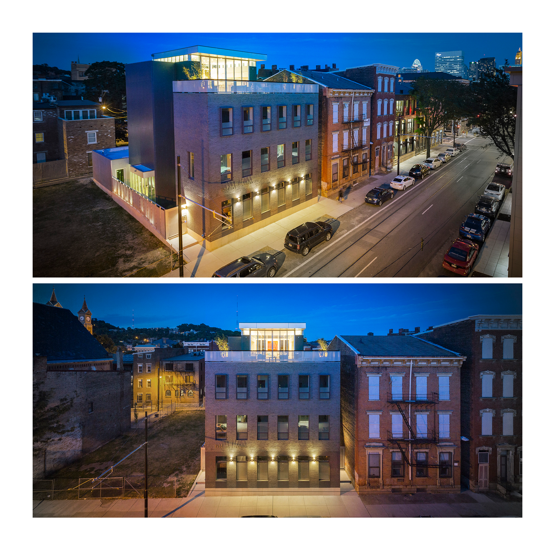 The Stannary is a four-story, 3 unit urban infill project located in the historic Over-the-Rhine neighborhood of Cincinnati. The owners occupy the 3rd and 4th floors and the remaining floors are apartments. The site strategy was based on maintaining maximum street frontage on the West, Race Street facade while creating courtyards to the South and North of the building to let in more light in the long dimension of the building. All units have access to exterior space and terraces, and the 4th floor has a generous terrace overlooking Race Street with a large, retractable glass wall opening to the kitchen and living area. There is another terrace facing East that is also accessible from the 4th floor living area.