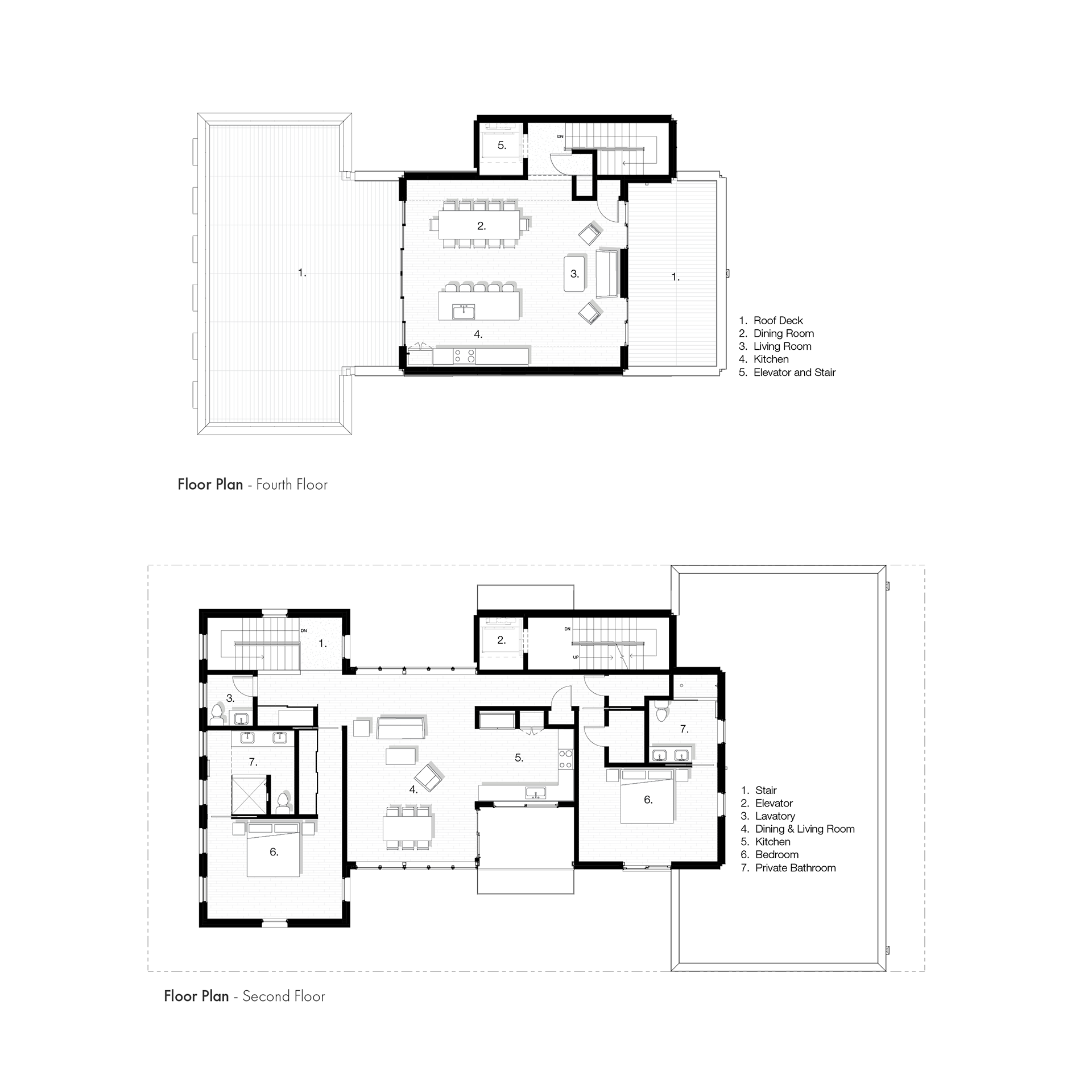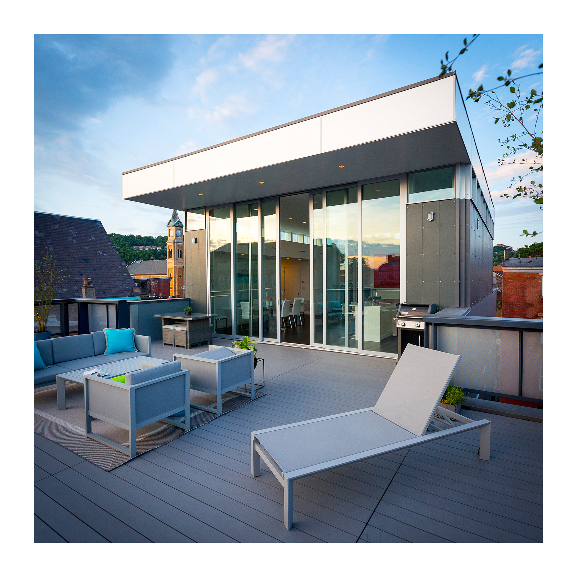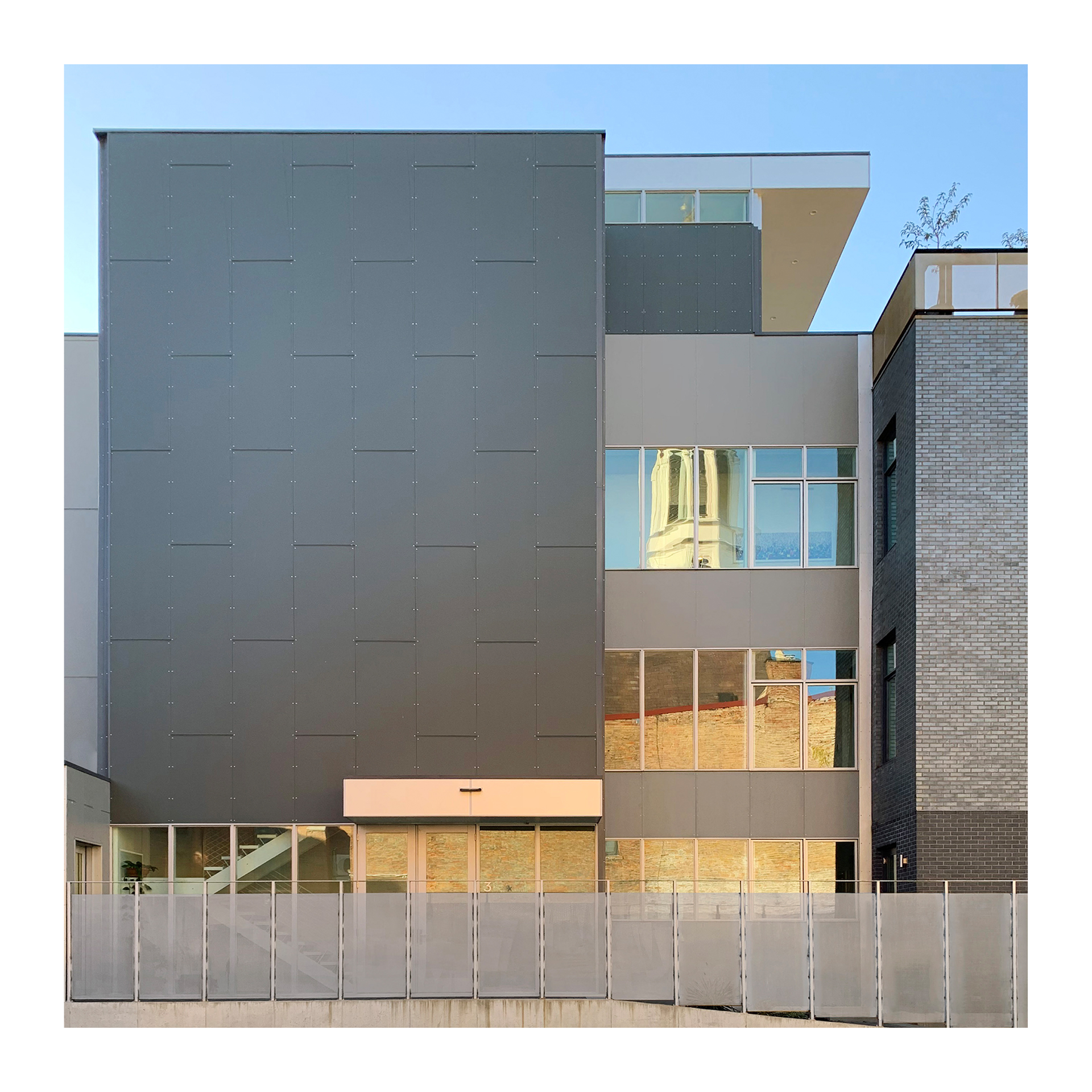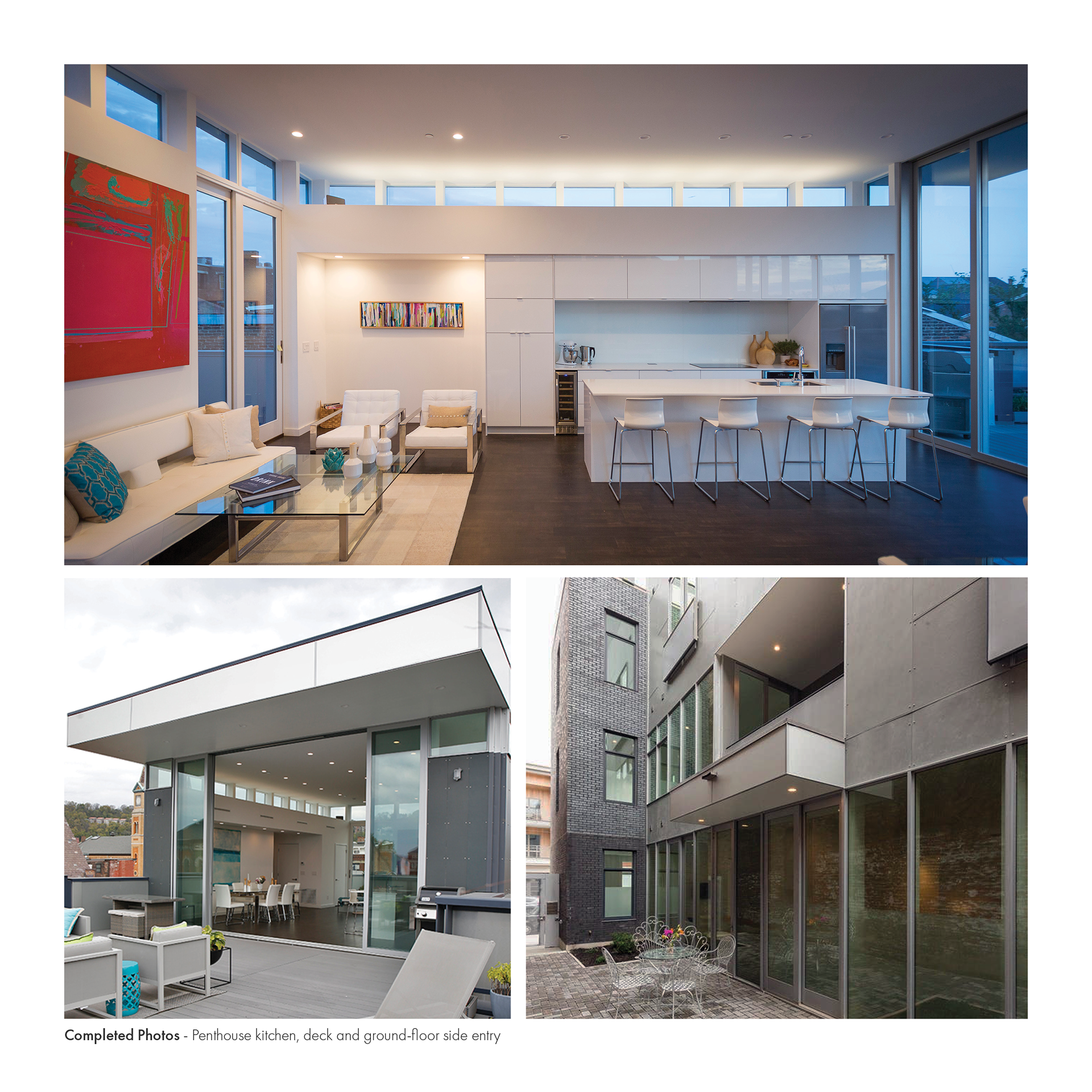 The Stannary is a four-story, 3 unit urban infill project located in the historic Over-the-Rhine neighborhood of Cincinnati. The owners occupy the 3rd and 4th floors and the remaining floors are apartments. The site strategy was based on maintaining maximum street frontage on the West, Race Street facade while creating courtyards to the South and North of the building to let in more light in the long dimension of the building. All units have access to exterior space and terraces, and the 4th floor has a generous terrace overlooking Race Street with a large, retractable glass wall opening to the kitchen and living area. There is another terrace facing East that is also accessible from the 4th floor living area.